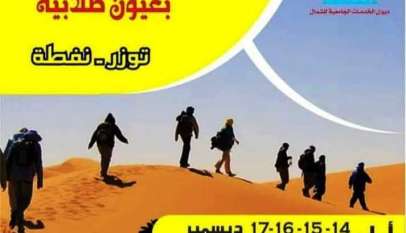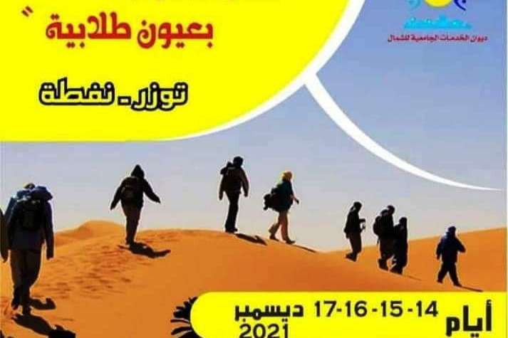 في بادرة ثقافية ترفيهية لفائدة طلبة جهات الشمال التونسي ينظّم المركز الجامعي للتنشيط الثقافي والرياضي بحندوبة الذي تشرف على ادارته الاستاذة منية بوسليمي وبتنسيق منها وبالشّراكة مع المراكز الجامعية للتنشيط الثّقافي و الرياضي بكل من الكاف وبسليانة وبنابل ولاولّ مرة تظاهرة بعنوان” سحر الجنوب بعيون طلابية”وهي قافلة ثقافية طلابية الى ولاية توزر وخاصة منطقة نفطة تنتظم من 14 الى 17 ديسمبر الجاري وستتخللها ورشات في الموسيقى والكوليغرافيا والمسرح ورسم لوحات حرّة لمعالم الجنوب بعيون طلابية الى جانب تقديم لوحات راقصة