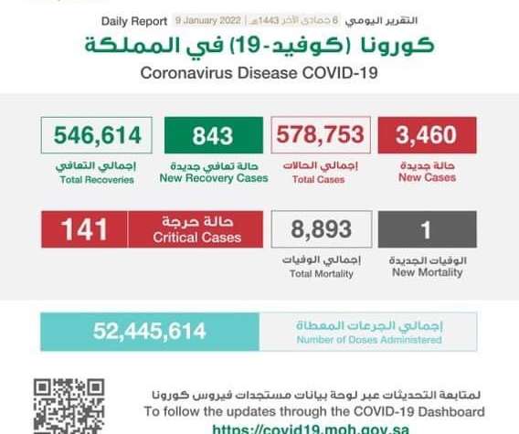 وفيما يخص الوفيات فقد تم تسجيل عدد حالة واحدة ، حيث وصل إجمالي عدد الوفيات في المملكة (٨٨٩٣) حالة “يرحمهم الله جميعاً”.