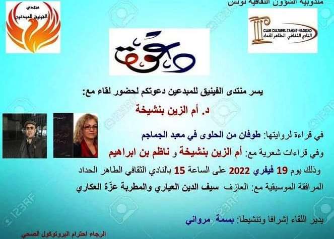بعد توقف الانشطة الثقافية بسبب القرارات ذات الصلة بالوقاية من عدوى جائحة كوفيد 19 تستأنف هذه الانشطة حيث يكون موعد رواد ” منتدى الفينيق للمبدعين” ويبن أعمدة النّادي الثّقافي الطّاهر الحدّاد في قلب المدينة العتيقة مساء يوم 15 فيفري الجاري مع لقاء حواري أدبي بعنوان “الدكتورة أم الزين بنشيخة :مفرد مبدع في صيغة الجمع”حيث تتم محاورة ضيف المنتدى كشاعرة وناقدة وروائية وفيلسوفة ومن خلال جملة من الفقرات وهي خوض في رواية “طوفان من الحلوى في معبد الجماجم ” وفي تقديم لبسمة مرواني المشرفة على منتدى الفينيق للمبدعين ثم فقرة “انشاد شعري”مع الثنائي ام الزين بنشيخة وناظم بن ابراهيم ويتخلل اللقاء مرافــقة موسيقية غنائية مع العازف سيف الدين العياري و المطربة عزة العكاري
