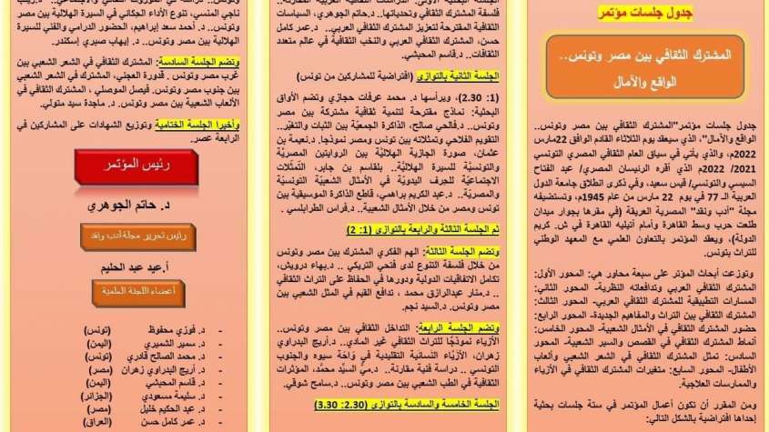 يعقد يوم الثلاثاء القادم الموافق 22مارس 2022م، والذي يأتي في سياق العام الثقافي المصري التونسي 2021/ 2022م الذي أقره الرئيسان المصري/ عبد الفتاح السيسي والتونسي/ قيس سعيد، وفي ذكرى انطلاق جامعة الدول العربية الـ 77 في يوم 22 مارس من عام 1945م، وتستضيفه مجلة “أدب ونقد” المصرية العريقة (في مقرها بجوار ميدان طلعت حرب وسط القاهرة وأمام أتيليه القاهرة في ش. كريم الدولة)، ويعقد المؤتمر بالتعاون العلمي مع المعهد الوطني للتراث بتونس.