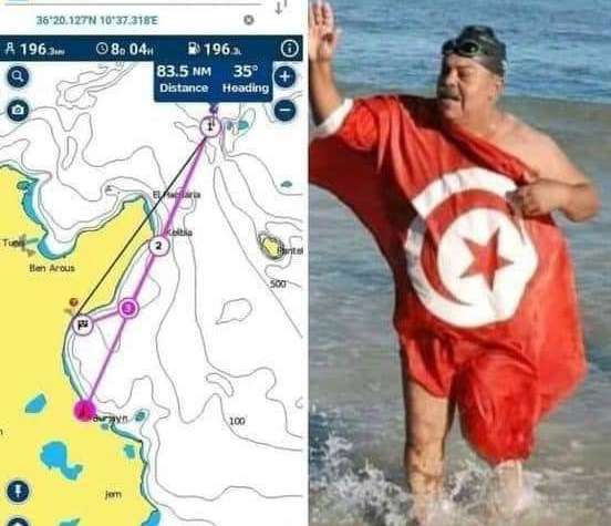 انه السباح التونسي نجيب بالهادي فهو يسبح الآن من بنتالاريا الايطالية نحو تونس بدون توقف قاطعا مسافة تبلغ 155 كلم ومحققا رقما قياسيا عالميا…علما ان وصوله سيكون اليوم في الساعة الخامسة مساء بمنطقة باسمين الحمامات والسباح العالمي الذي يناهز يستحق كل الدعم والمساندة عمره69سنة بطل باتم معنى الكلمة و لا من التشجيع من كافة التونسيين .
