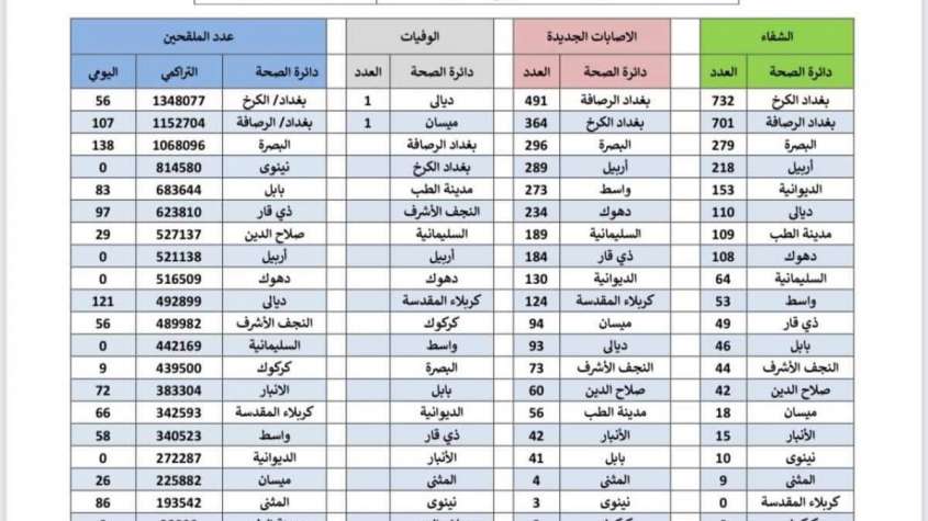 وأضاف البيان أن “الوفيات الجديدة بكورونا بلغت حالتين اثنتين في عموم محافظات البلاد”، مبينا أن “الأشخاص الذين تلقوا اللقاح خلال 24 ساعة بلغ عددهم 1004”