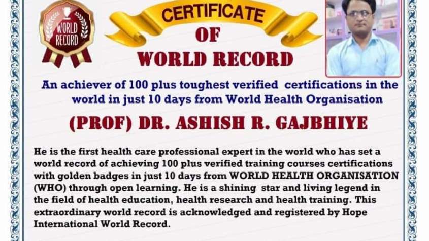 Eminent Health Care Professional of india, Multiple times World Record Holder Prof.Dr.Ashish Gajbhiye is the only person in the world who has been set a record of achieving 100 Verified Certificates of Achievements in just 10 days from World Health Organization and This Extraordinary World Records was registered and acknowledged by Hope international book of records. The List of Certificates of Achievements as given below.:. 1)WHO policy guidance on integrated Antimicrobial stewardship Activities. 2)Monkey Pox; epidemiology, preparedness and response for African out break context. 3) Leadership and programme management in infection prevention and control. 4) Influenza prevention and control. 5) Ethics and Governance of artificial intelligence for health. 6)An integrated approach to building health systems resilience. 7)Rapid diagnostic for detection. 8)Visceral Leishmaniasis East Africa. 9) Tropical dermatology a syndrome based approach. 10) Antimicrobial stewardship programmes in health Care facilities in Low middle income countries a WHO practical toolkit. 11) Monkey Pox; Introductory course for African and beak contest. 12)Leprosy training of health workers on Skin NTDS. 13) Tuberculosis preventive treatment. 14) Social prescribing. 15)How systematic Listening and community feedback own help us better respond to Covid-19. 16) Prevention identification and management of infections in health workers in the context of Covid-19. 17) Catheter associated Urinary tract infections. 18)Yellow fever. 19) Infodemic management. 20)E- protect respiratory infections. 21) Introduction to poliomyelitis and the global polio eradication initiative. 22) Social Net , Social and behavioural insight Covid-19 data collection tool. 23) Clinical management of patients with Covid-19 rehabilitation of patients with Covid-19. 24)Drug resistant Tuberculosis treatment. 25) Clinical management of patients with Covid-19 investigations and care for mild moderate and severe. 26)Reducing Antimicrobial resistance and treatable sexually transmitted infections in antenatal Care. 27)Drug resistant Tuberculosis,How to interpret rapid molecular test records. 28) Standard precaution hand hygiene. 29) Decontamination and sterilization of medical device 30)Severe acute respiratory infection treatment and facility design. 31) Introduction to Covid 19, methods for detection, prevention, response and control. 32) Standard prevention waste management. 33)Key considerations for SARS-CoV-2 antigen RDT implement. 34)WHO Covid 19 mass gatherings risk assessment training. 35) Infection prevention and control components and multimodal strategies. 36) Standard precaution environmental cleaning and disinfection. 37)Long term care facilities in the context of Covid-19. 38) introduction to infection prevention and control. 39) Neglected tropical disease in the context of the Covid-19 pandemic impact and guidance. 40) Clinical management of patients with Covid-19 general considerations. 41) Occupational health and safety for health workers in the context of Covid-19. 42) Basic microbiology. 43) Middle East respiratory syndromes. 44) Plaque introduction. 45) Crimean-Congo Haemorrhagic fever. 46) Cholera revised Cholera kits and Calculation tool. 47)Lassa fever introduction. 48)Rift valley fever introduction. 49) Meningitis introduction. 50) Cholera introduction. 51) Podoconiisis training of health workers at national and District Levels on Skin.