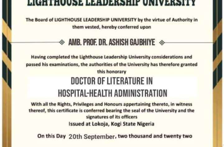 DR.ASHISH GAJBHIYE CONFERRED WITH HONORARY DOCTORATE OF LITERATURE BY ThE PRESTIGIOUS UNIVERSITY OF NIGERIA. Renowned Policy Maker of Health, World Record Holder, World health Ambassador, Eminent Professor of India Dr.Ashish Ravindra Gajbhiye was Conferred the Honorary Doctorate of Literature (D.Lit)in Hospital -Health Administration By the Chancellor,Registrar and Board of Directors of the Light House Leadership University ,Nigeria. Dr.Ashish Gajbhiye is the only Professor in India Who has been Received a Prestigious Doctor of Science (D.S.C), Doctor of Philosophy (P.H.D) and Doctor of Literature (D.LIT) in Hospital and Health Administration.Dr.Ashish Gajbhiye was a Principal at college and He was trained the thousands of College Students across india .He is an Professional Health Care Leader in India and Expert trainer of Health for Post graduate health Care trainees .by the Leading University of Dubai that is Mohammad Bin Rashid University of Medicine and Health Sciences.Dr.Ashish Gajbhiye was a Chief Executive Officer and Chief Medical Administrator at Several Corporate Multispeciality Hospitals in Maharashtra.Dr.Ashish Gajbhiye was Honoured with Many international and National awards from Various Countries Like India, Dubai, South Africa, Nigeria, Philippines,Indonesia, Bangladesh, Egypt, USA,UK, etc.Dr.Ashish Gajbhiye is a Shining Star and Living Legend in the the field of Hospital and Health Administration.