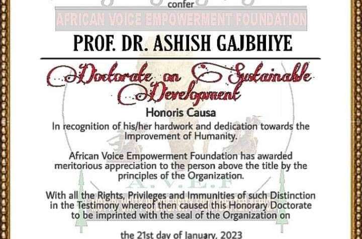 LOPMENT. Eminent Academician, Distinguished Professor and Leader in Hospital Health Care Management Prof.Dr.Ashish Gajbhiye has been Conferred the Distinguished Honorary PHD in Sustainable Development by the Director General Dr.Wilfred Enemona Isah Esq.of African Voice Empowerment Foundation Nigeria for his Extraordinary and Outstanding contributions in the field of Hospital Health Care Management. Prof.Dr. Ashish Gajbhiye is an global educator and distinguished professor of Hospital Health Care Management and He is a Legend in Hospital and Health Care industry