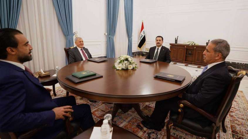 رئيس مجلس الوزراء العراقي محمد شياع السوداني.يستضبف في القصر الحكومي اجتماعا. ضم رئيس الجمهورية عبد اللطيف جمال رشيد. ورئيس مجلس النواب ورئيس مجلس القضاء الأعلى