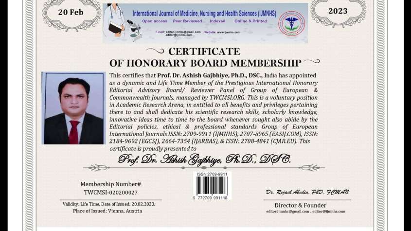 PROF ASHISH GAJBHIYE APPOINTED AS EDITORIAL ADVISORY BOARD MEMBER IN IJMNHS, AUSTRIA. An Stalwart in the field of Hospital Health Care Management, Eminent Global Educator and Legendary Professor of Hospital Health Care Management Prof Dr. Ashish Gajbhiye has been appointed as Hon.Editorial Advisory Board Member by the Editor in chief Dr. Rejaul Abedin of international journal of medicine, Nursing and Health Sciences, Vienna, Austria. The international Austrian Journal is one of the most Famous and Leading journal in the field of Medicine and Health. Prof Dr.Ashish Gajbhiye is well known for his Extraordinary and Outstanding contributions in the field of Hospital Health Care Management and Distinguished Personality in the field of Education ,Research and Training across the globe. Prof.Dr. Ashish Gajbhiye work are as follows. 1) An receipent of highest number of Honorary Doctorates in the field of Hospital Health Care Management. 2)An achiever of Highest number of Certificates of Achievements by World health organization. 3) Most qualified Doctor in India with Multiple world records. 4) An achiever of More number of Covid 19 honours by Govt universities, Private Universities and international organizations. 5) He was a principal and CEO in India and Holds Many honorary positions like Hon. President,Hon.Chancellor ,Hon.Pro Chancellor, Hon.Dean, Hon.Global Professor,Hon.Distinguished Professor etc.