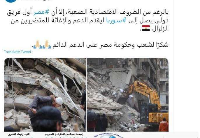 (( بالرغم من الظروف الاقتصادية الصعبة، إلا أن مصر أول فريق دولي يصل إلى سوريا ليقدم الدعم والإغاثة للمتضررين من الزلزال.. شكرًا لشعب وحكومة مصر على الدعم الدائم ))