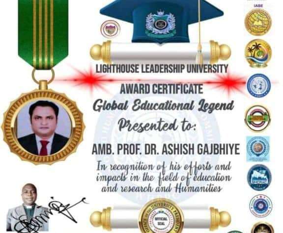 GLOBAL CONTRIBUTIONS IN EDUCATION ” BY DR. ASHISH GAJBHIYE “. Prof. Dr. Ashish Gajbhiye is Well known Multi- iconic Personality in Education and Health and transforms the Life of thousands of People’s and Students from Darkness to Light of Hope . His international and national Positions are as follows 1)