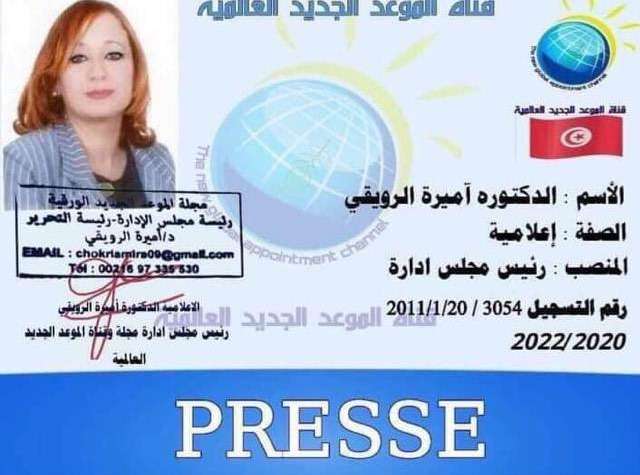 ان مجلة وصحيفة وقناة الموعد الجديد العالمية تصل الآن الى سنتها ال13 مؤسستها الاعلامية التونسية الدكتورة الاعلاميةٱميرة الرويقي رئيسة مجلس الادارة والتحرير لصحييفة وقناة ومجلة الموعد الجديد العالمة