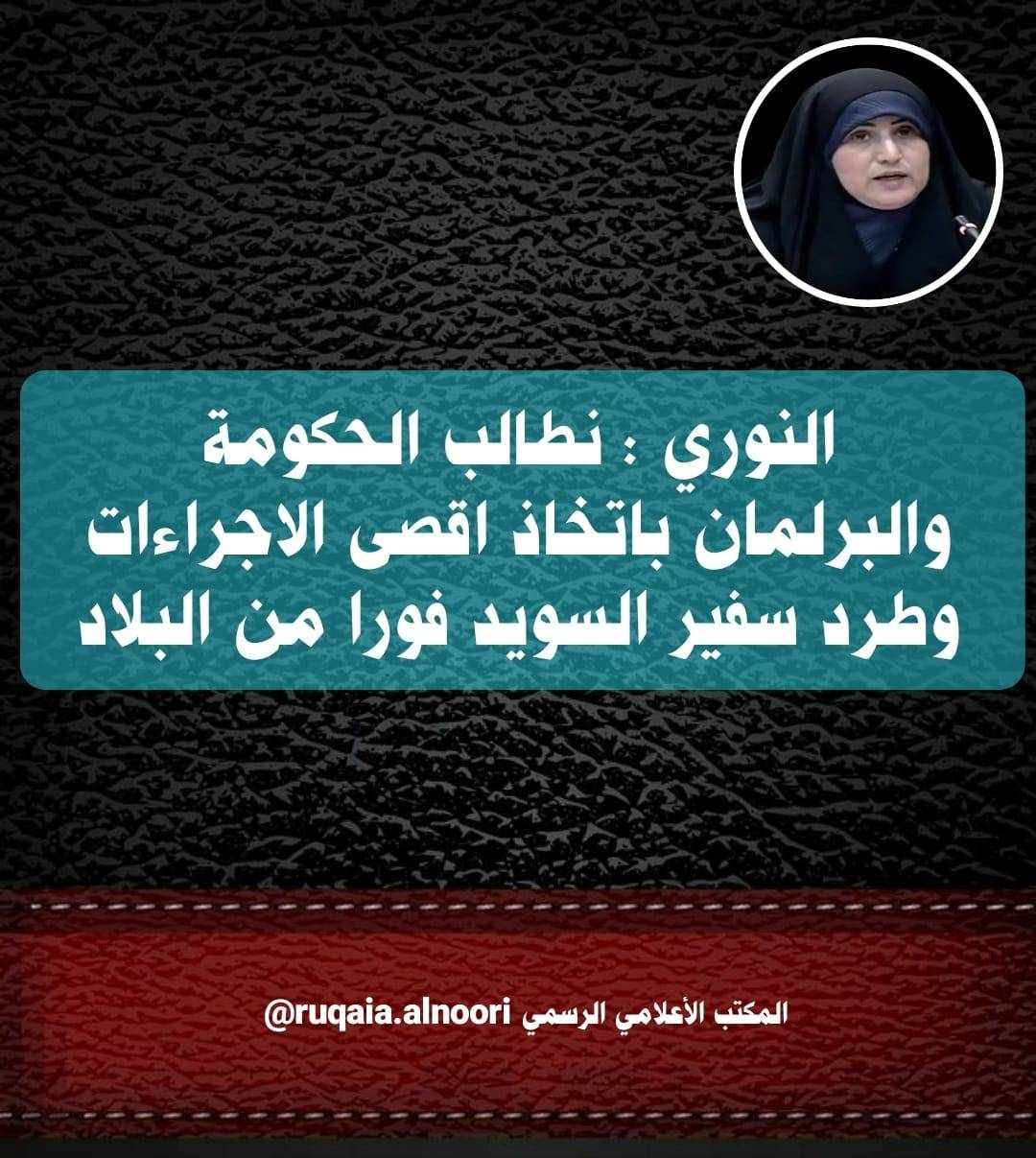 اعلنت عضو مجلس النواب العراقي رئيس كتلة تيار الفراتين النيابية رقية النوري الخميس رفضها الشديد لموقف حكومة السويد في تجديدها لحرق القران الكريم والعلم العراقي .