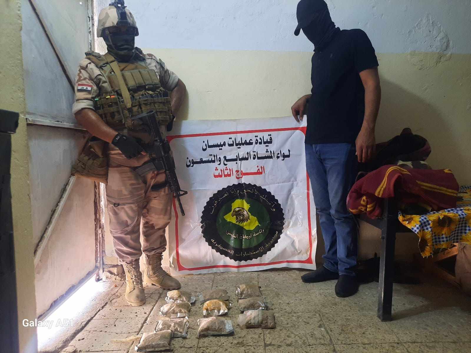إستناداً لتوجيهات قائد عمليات ميسان الفريق الركن محمد جاسم الزبيدي بمكافحة افة المخدرات والمؤثرات العقلية ، قوة من الفوج الثالث لواء المشاة السابع والتسعون التابع لقيادة العمليات وبالإشتراك مع مفرزة من مكافحة مخدرات ميسان وأثناء البحث والتفتيش تم العثور على 10 ألاف حبة من حبوب ( الكبتاجون ) المخدرة في ناحية العزير – محافظة ميسان.