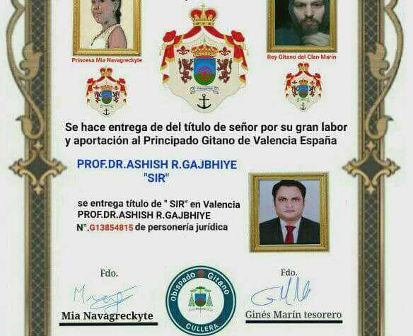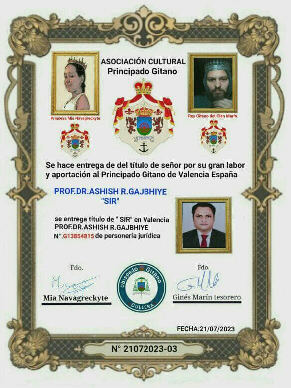 NOBILITY TITLE ” SIR” BY ROYAL GYPSY HOUSE OF PANZONES. An Eminent Hospital – Health Administrator of India, Distinguished Leader in Public health Management and Global Professor Dr. Ashish Ravindra Gajbhiye has been Granted the Nobility title “SIR “by the 19 th King Dr. Gines Marin of Royal Gypsy House of Panzones with an official royal registration N ‘ 21072023-03. Prof.Dr Ashish Gajbhiye of India officially became an ” Prof.Dr. Sir Ashish Gajbhiye. Dr. Ashish Ravindra Gajbhiye is one of the most influential Personality in India and World Wide.