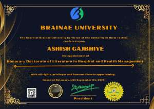 DR. ASHISH GAJBHIYE BESTOWED WITH AN HONORARY D. Lit BY BRAINAE UNIVERSITY, USA. An Eminent Academician and Distinguished Hospital- Health- Medical Administrator Prof. Dr. Ashish Gajbhiye has been Conferred an Honorary Doctorate of Literature ( D. Lit ) in Hospital and Health Management by the Chancellor Prof.Dr. Mbonigaba Celestine of Brainae University, Delaware, United States of America through virtual mode . Prof. Dr. Ashish Gajbhiye is one of the most famous Hospital Administrator of India and Esteemed Social Worker who possesses a remarkable drive to His Exemplary Leadership as the Hospital- Health Care Administrator with his Visionary ideas and Progressive Approach he has brought about Significant positive Changes in the Society and Country. His Commitment to Nurturing young minds and Fostering a Culture of Academic Excellence has truly set him apart. In recognition of his Extraordinary and Outstanding contributions to Hospital- Health Management and Social upliftment Dr. Gajbhiye’s Honorary DLit is a Well deserved honour .It not only Celebrates his Achievements but also serves as a reminder of the immense Potential within each individual to make a Lasting impact.