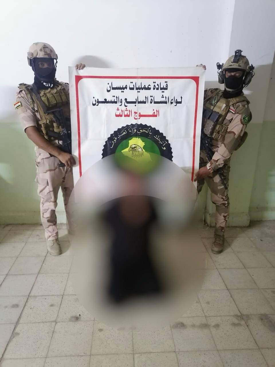 إستناداً لتوجيهات قائد عمليات ميسان الفريق الركن محمد جاسم الزبيدي بمكافحة المخدرات بكافة إشكالها ، والقبض على المطلوبين ، قوة من الفوج الثاني لواء المشاة السابع والتسعين التابع لقيادة العمليات وبالإشتراك مع شعبة مخدرات المجر تلقي القبض على (٥) مطلوبين وفق أحكام المواد (٢٨) و (٣٢) مخدرات وتم ضبط بحوزتهم كيس يحتوي على مادة ( الكريستال المخدرة ) وأنبولة زجاجية تستخدم للتعاطي ، وبالإشتراك مع مركز شرطة الزهراء تم القبض على احد المطلوبين وفق أحكام المادة (٤٣٠) تهديد في قضاء المجر الكبير.