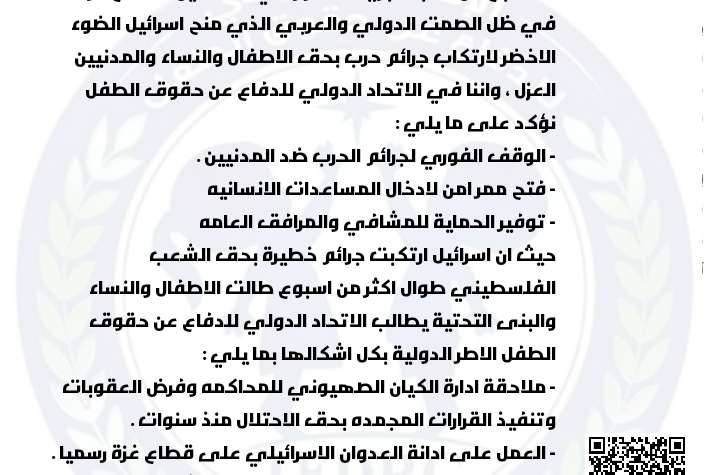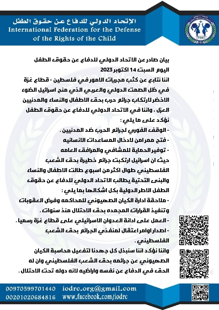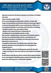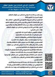 فلسطين/بيان صادر عن الاتحاد الدولي للدفاع عن حقوق الطفل
