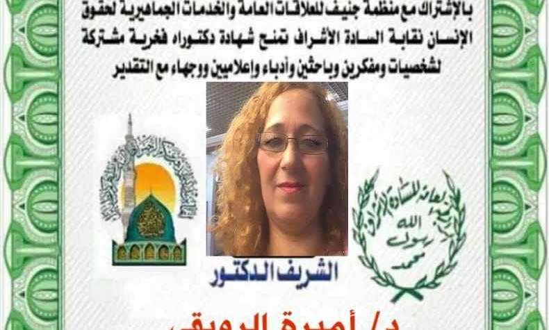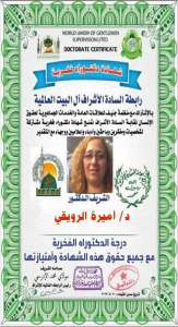 رابطة اشراف ال البيت العالمية وشهادة دكتوراه فخرية للدكتورة ٱميرة الرويقي المستشارة القاضية بالمحكمة الدولية لتسوية المنازعات