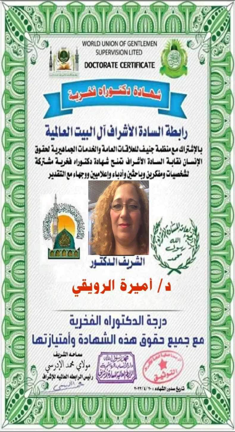 شكرا لأنه ثم الحصول من رابطة السادة الاشراف ال البيت العالمية على شهادة الدكتوراه الفخرية الرسمية.مع تحيات دكتورة أميرة الرويقي سفيرة السلام بمنظمة الأمم المتحدة رئيسة مجلس الادارة والتحرير لصحييفة وقناة ومجلة الموعد الجديد العالمية والشاعرة الادبية التونسية