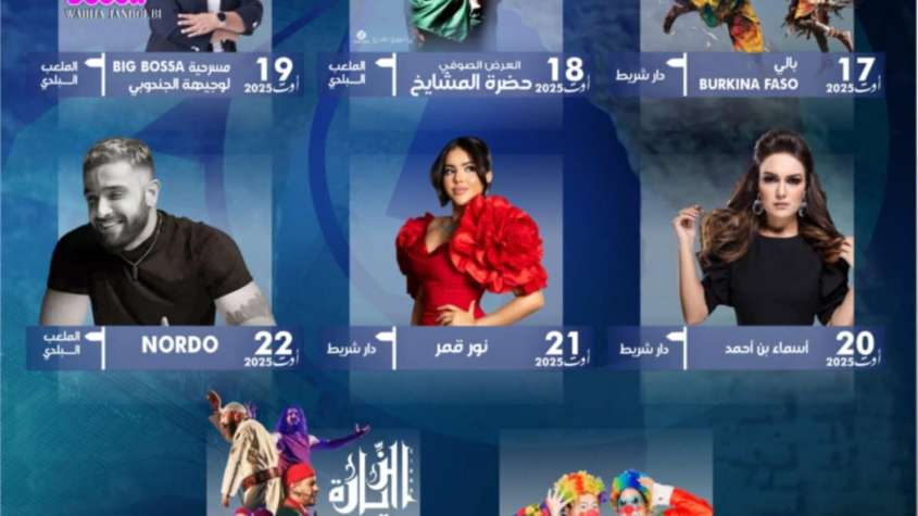 الافتتاح سيكون في مركب دار شريط مع عرض الباليه الموسيقي التنشيطي من بوركينا فاسو، فيما يحتضن الملعب البلدي محمد الطمباري عرض “حضرة المشايخ” في 18 أوت، تليه مسرحية BIG BOSS لوجيهة الجندوبي في 19 أوت، ثم عرض نوردو في سهرة 22 أوت، وعرض “الزيارة” في 25 أوت.