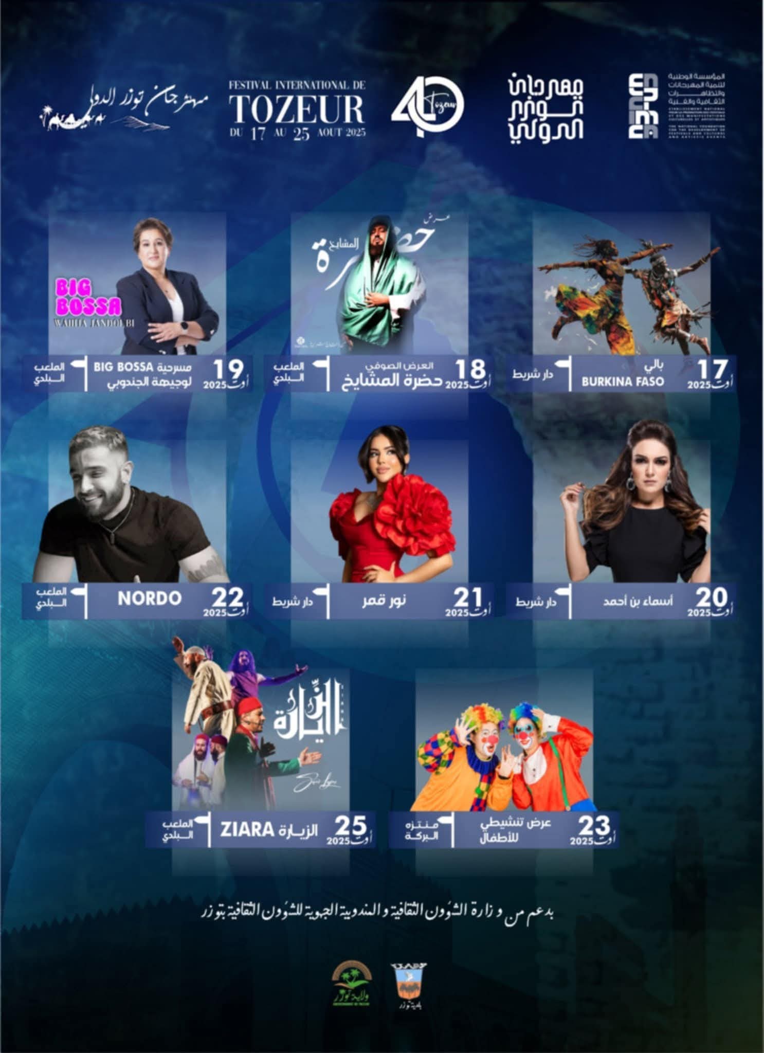 بين دفء الصحراء ونسمات الصيف، تستعد مدينة توزر لاحتضان الدورة الأربعين من مهرجانها الدولي الصيفي، الذي سينطلق من 17 إلى 25 أوت الجاري، تحت إشراف وزارة الشؤون الثقافية، وبدعم من المؤسسة الوطنية لتنمية المهرجانات والتظاهرات الثقافية والفنية، والمندوبية الجهوية للثقافة.