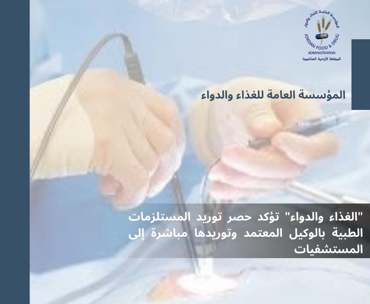 عممت المؤسسة العامة للغذاء والدواء / الاردنية عن حصر توريد المستلزمات الطبية التي تزرع بشكل دائم داخل جسم الانسان بالوكيل أو الموزع المعتمد لديها، بحيث تتم عملية التوريد مباشرة إلى المستشفيات المعنية بإجراء التدخلات الجراحية.