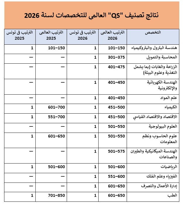 تواصل جامعة تونس المنار نسج مسارها المتصاعد بثبات في المشهد الأكاديمي العالمي، مؤكدة حضورها كإحدى أبرز القلاع العلمية في المنطقة، وذلك من خلال إنجاز لافت في تصنيف “QS” الدولي للجامعات حسب التخصصات لسنة 2026، فقد نجحت الجامعة في إدراج 14 تخصصاً ضمن قائمة النخبة العالمية، متصدّرة المشهد الوطني دون منازع في جميع هذه المجالات.