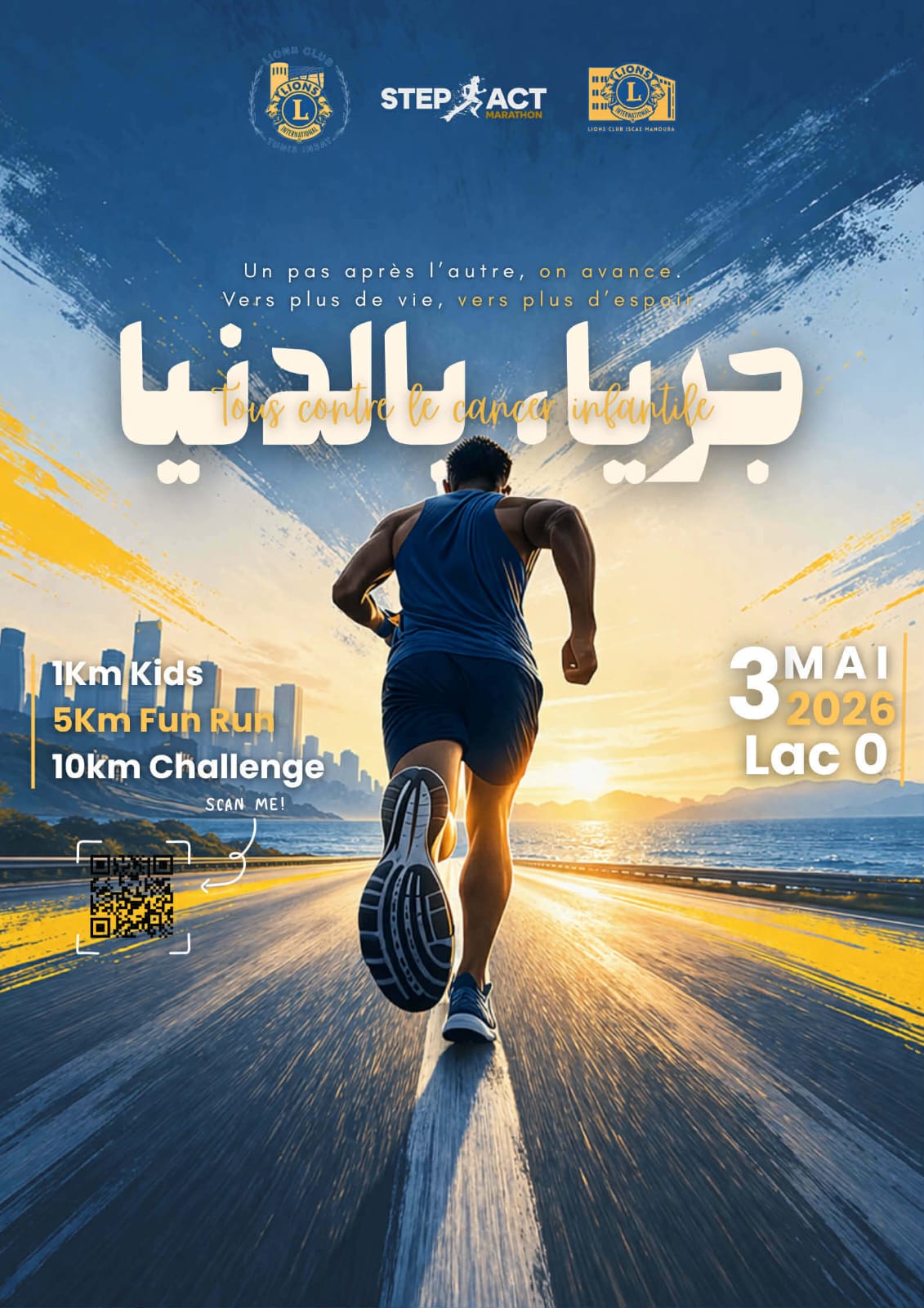 خطوة نحو الأمل: ماراطون “Step’Act” يجمع الرياضة بالتضامن م تجمع بين الروح الرياضية والعمل الإنساني، ينظم نادي Lions Club ISCAE بمنوبة بالتعاون مع Lions Club INSAT ماراطون “Step’Act”، وذلك يوم الأحد 3 ماي 2026 بمنطقة البحيرة (Lac 0)، في تظاهرة تهدف إلى ترسيخ قيم التضامن والعطاء داخل المجتمع, ويقدّم هذا الحدث الرياضي ثلاثة مسارات مختلفة تلائم جميع الفئات العمرية والبدنية، حيث خُصصت مسافة 1 كلم للأطفال، و5 كلم للهواة، و10 كلم للمحترفين، بما يتيح فرصة المشاركة أمام الجميع في أجواء يسودها الحماس وروح المشاركة, ولا يقتصر هذا الماراطون على الجانب الرياضي فحسب، بل يحمل في طياته رسالة إنسانية نبيلة، إذ يهدف إلى جمع التبرعات لاقتناء مضخات للحقن لفائدة الأطفال المصابين بالسرطان بمستشفى عزيزة عثمانة ، في خطوة من شأنها دعم جهود الإطار الطبي وتحسين ظروف العلاج والرعاية لهؤلاء الأطفال.