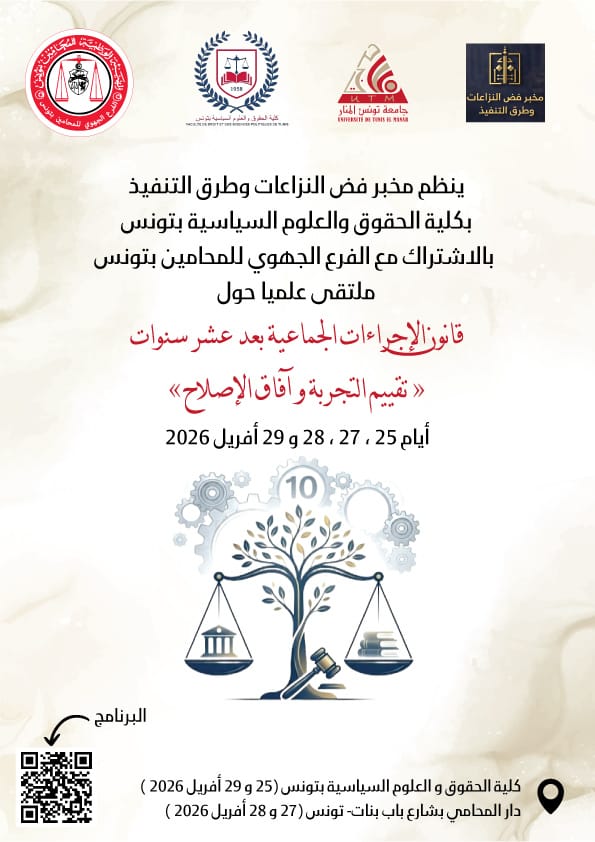 ينظم مخبر فض النزاعات وطرق التنفيذ بكلية الحقوق والعلوم السياسية بتونس، بالتعاون مع الفرع الجهوي للمحامين بتونس، ملتقى علميا هاما تحت عنوان: “قانون الإجراءات الجماعية بعد عشر سنوات: تقييم التجربة وآفاق الإصلاح”، وذلك أيام 25 و27 و28 و29 أفريل 2026، وسيكون التوزيع الزمني ومكان التنظيم حسب ما يلي: